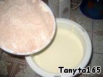 Всыпаем всю муку и быстро перемешиваем. Для того, чтобы всё хорошенько размешать у нас есть ТОЛЬКО 30 СЕКУНД!!!!!!!!