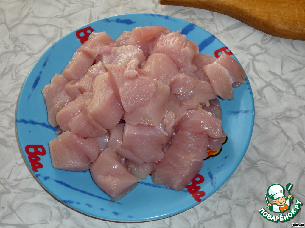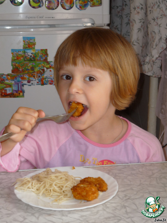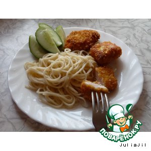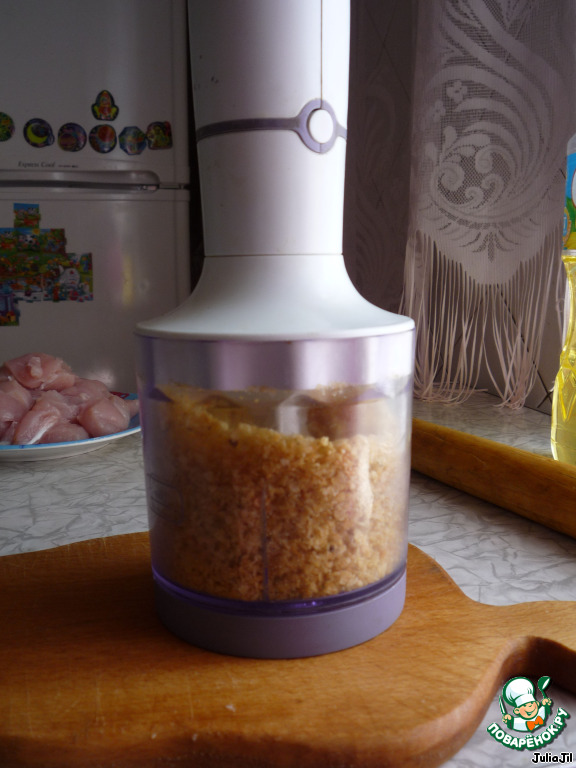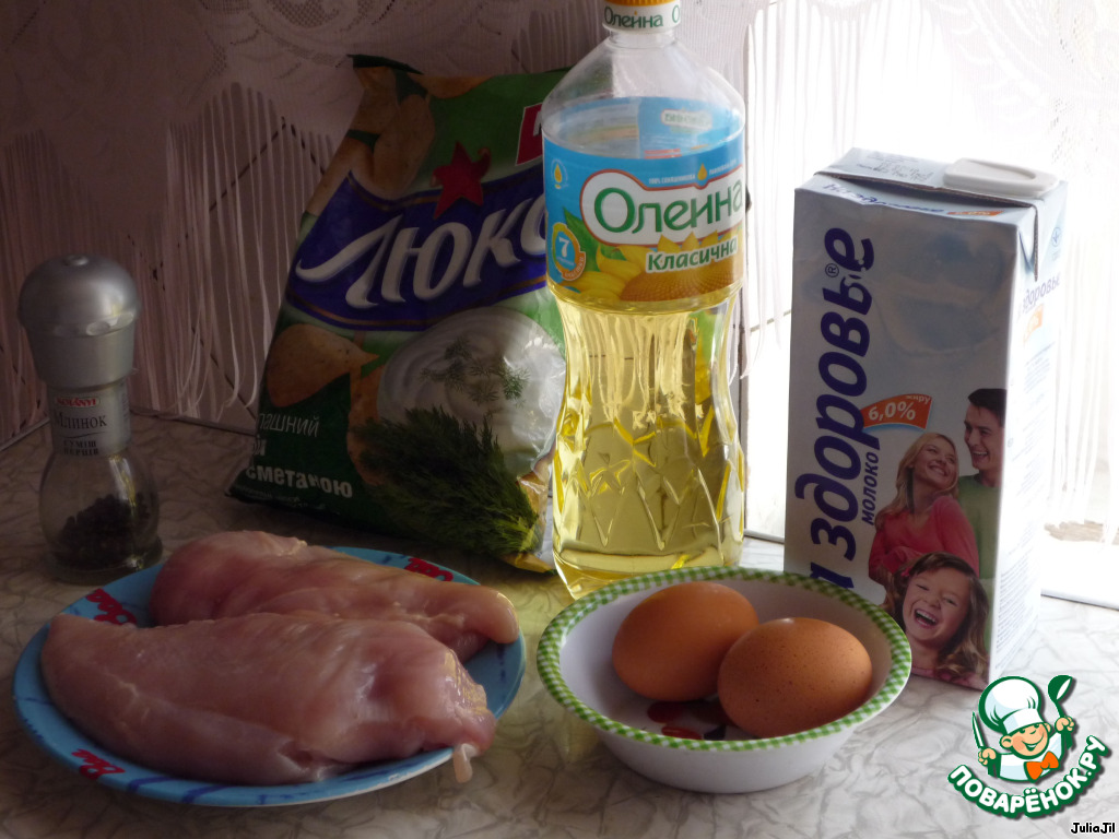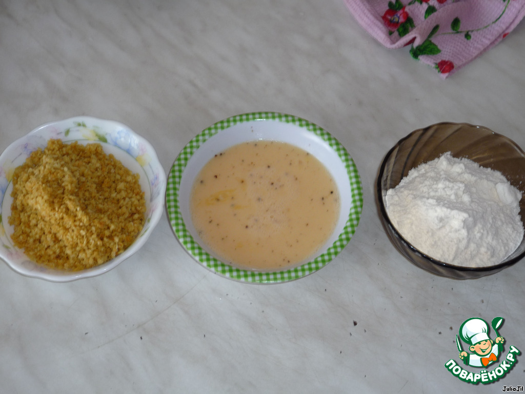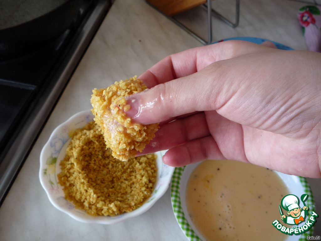 Каждый кусочек окунаем по очереди: в муку, яйцо и чипсы.