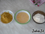 Для удобства я расставила тарелочки со смесями в таком порядке: мука, яйцо, чипсы (справа налево).