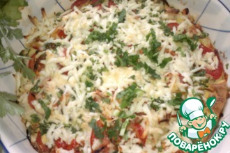 • Сверху посыпаем натёртой на крупной тёрке моцареллой и молотой паприкой. Немного подворачиваем края фольги, сделав бортики, чтобы сыр не растёкся. И ставим в духовку (180 градусов) минут на 15. На последних минутах лучше включить режим гриля сверху.