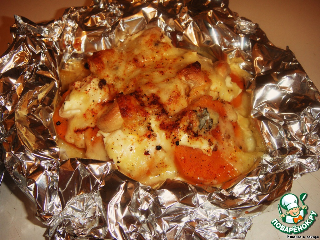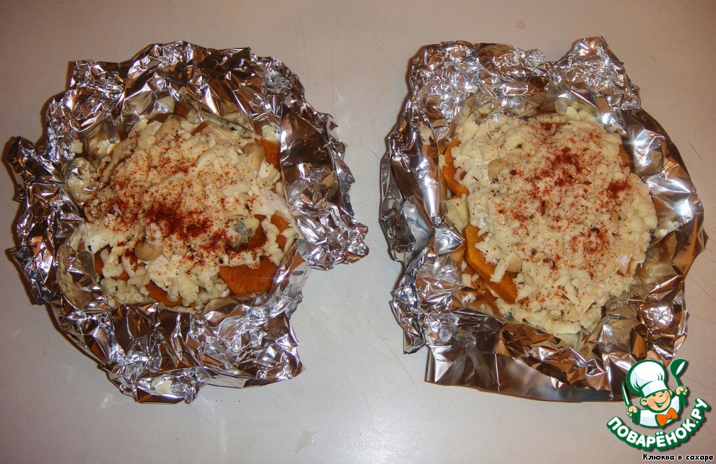 • Теперь формируем само блюдо. Если у вас есть порционные огнеупорные тарелочки, можно класть сразу в них. За неимением таковых, я использовала листы фольги. Кладём на каждый лист слой картофеля, сверху несколько «мазков» мягкого сыра, кусочки сыра с плесенью и орешки.