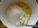 Приготовить творожную смесь: взбить творог с 2 яйцами и 150 г сахара.