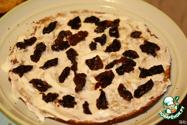 Каждый корж промазываем кремом и перекладываем черносливом.