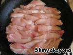 • Филе нарезаем полосочками среднего размера вдоль волокон и укладываем на сковороде. Добавлять масло, солить не нужно. Ставим на средний огонь и накрываем крышкой, тушим пока не выделится сок, снимаем крышку и продолжаем тушить до исчезновения жидкости.