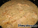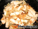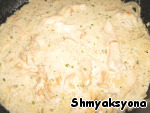 • Когда жидкости на сковороде почти не останется добавляем немного растительного масла, выкладываем лук и обжариваем до тех пор, пока филе и лучок немного не позолотятся, совсем чуть-чуть. Именно благодаря этому соус приобретет красивый кремовый оттенок. Если обжарить сильнее, то соус получится неаппетитного коричневого цвета, не такой вкусный, и мясо так можно легко пересушить.