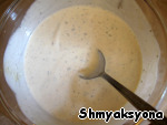 • Вполне успеем подготовить и соус. Смешиваем сметану со специями (на Ваш вкус) солью. Добавляем немного воды, столько, чтобы соус получился по густоте как тесто для блинов, количество воды завесит от сметаны, насколько она густа.