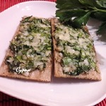 Хлебушек ставим в разогретую до 200C духовку, а в это время трем сыр на терке, мелко режем всю зелень, добавляем к сыру, туда отправляем 2 ст. л оливкового масла и перемешиваем. Достаем теплый хлебушек из духовки и кладем на него нашу начинку.