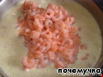 Натереть на мелкой терке сыр и, помешивая, добавить в суп. Добавить сливки, соль, перец, креветки и варить при слабом кипении 3-4 мин.