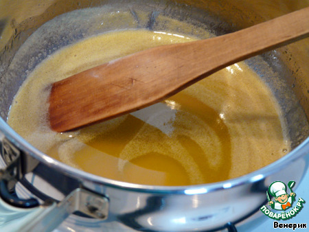 Поместить все компоненты для соуса (мёд, масло сливочное, апельсиновый сок), кроме кусочков апельсина, в кастрюлю и медленно довести до кипения.