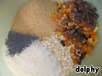 Смешайте овсяные хлопья, кокосовую стружку, шоколад и сахар в большой миске. У меня оказалось недостаточно кокоса, поэтому я добавила немного мака. И шоколада у меня было маловато, поэтому стакан я заполнила еще и сухофруктами. -