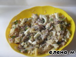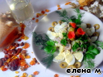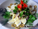 Выкладываем на блюдо (или в салатник), украшаем оливками, зеленью, ломтиками яиц.
