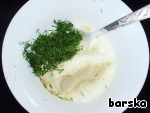 Приготовить соус: смешать сметану (майонез), укроп, посолить и поперчить, добавить давленный зубок чеснока.