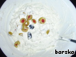 Смешать творог и сметану, выдавить чеснок через чеснокодавилку. Мелко нарезать лук и добавить в дип. Добавить нарезанные оливки, начинённые паприкой и маслины. Добавить прованские травы, соль и перец.