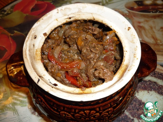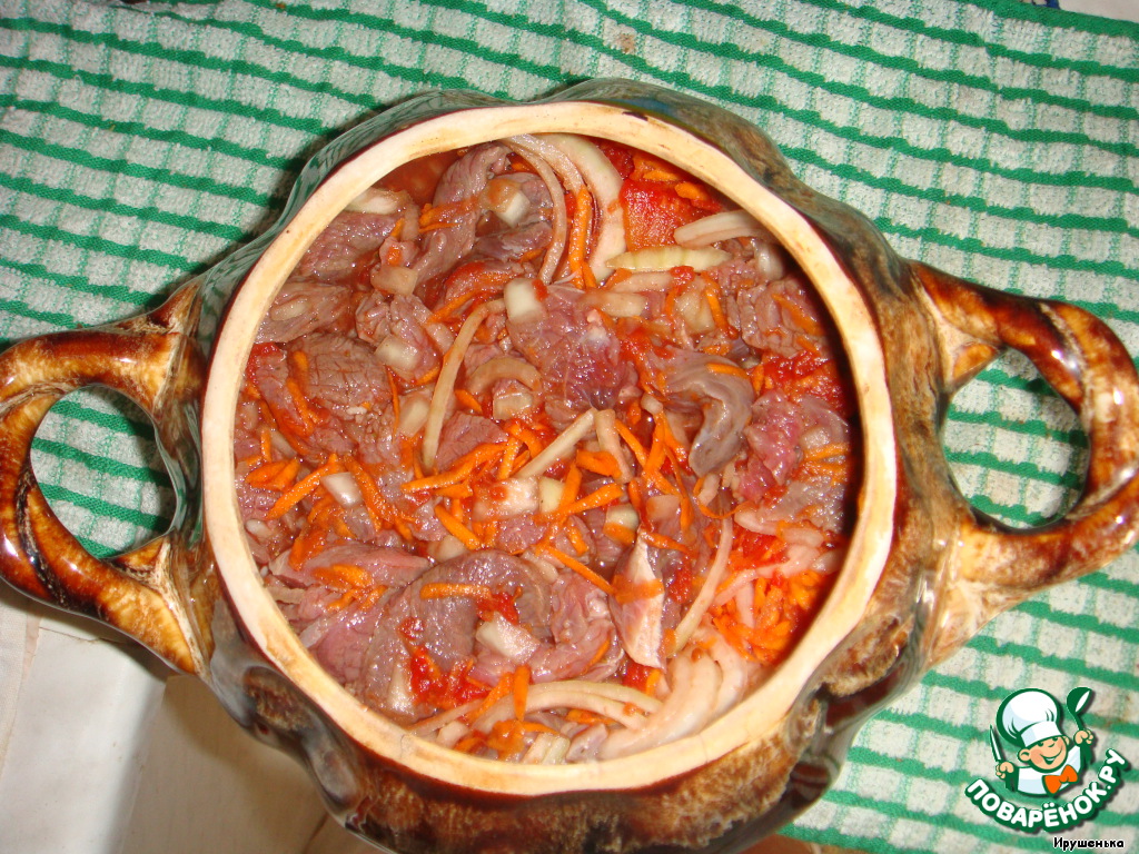 Вкусные мягкие кусочки говядины в горшочке с луком, морковью и томатами. Делается очень легко.
