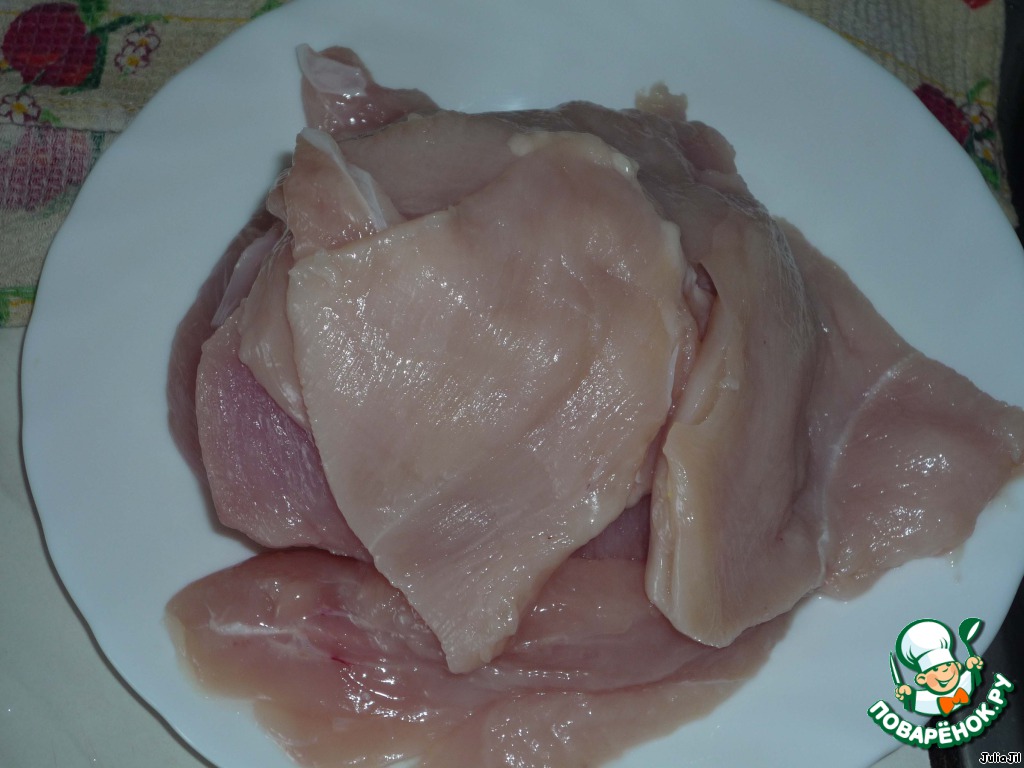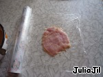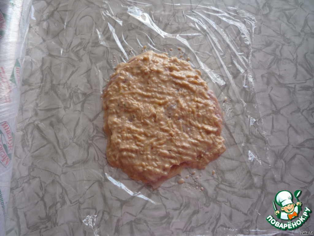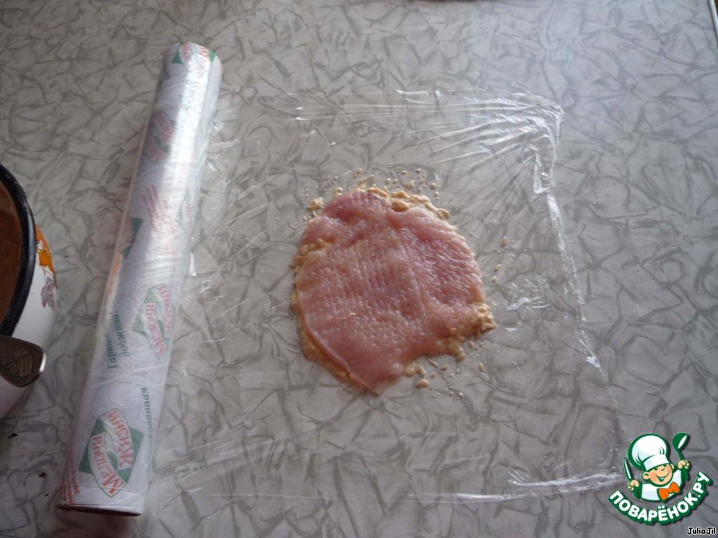 Тем временем на пищевую плёнку намазываем тоненький слой смеси из картофеля. Сверху положим филешку... -