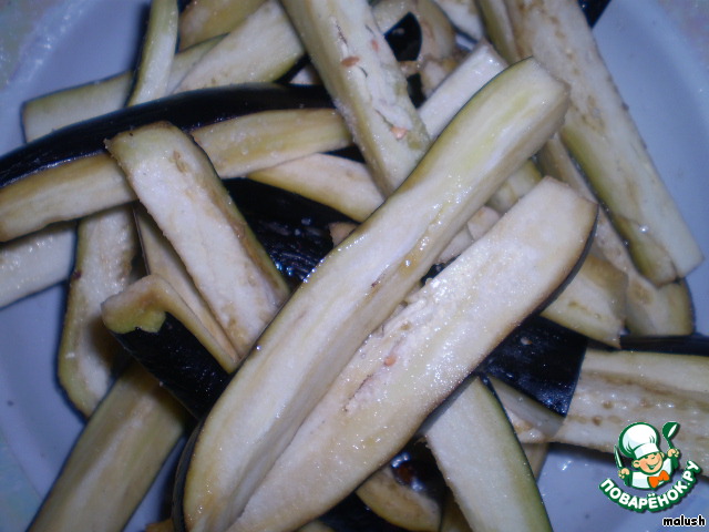 Баклажаны помыть, нарезать крупной соломкой, посолить и оставить на минут 10.