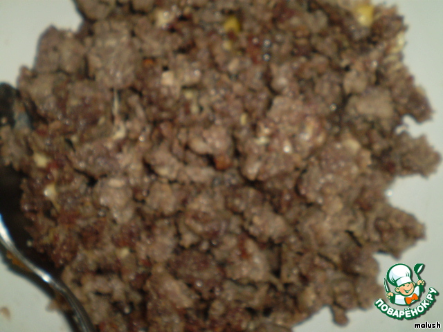 Фарш посолить, поперчить, выдавить чеснок, перемешать и обжарить на сковороде с подсолнечным маслом до готовности, в конце добавить сыр, нарезанный кусочками.