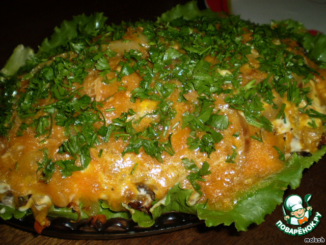 Собираем наше блюдо: на тарелочку покрытую листьями салата выкладываем баклажаны, затем фарш, чуть майонеза перемешанного с чесноком, выдавленным на чесночнице, лук с морковью, перец с помидором.