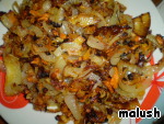 Лук, морковь очистить, лук нарезать полукольцами, обжарить, добавить морковь натертую на крупной терке, обжарить до золотистого цвета, выложить на тарелку.
