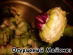 Отваренный до готовности артишок режем тонкими ломтиками. (Внимание: теперь самое время дочистить артишок! Отрежьте оставшиеся чешуйки, они могут быть жесткими и слишком волокнистыми.)