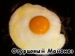 Растапливаем на сковороде сливочное масло и делаем «глазунью» из яйца. Советую включить медленный огонь: белок должен прожариться, а желток остаться сырым.