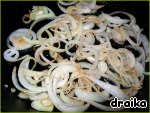 Нарезать лук тонкими кольцами и слегка обжарить на растительном масле до лёгкого подрумянивания.