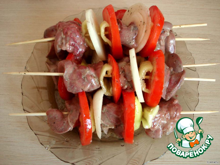 Нанизать ингредиенты на деревянные шпажки, перемежая печень с овощами. Сверху эти заготовки можно полить оставшимся от печени маринадом.