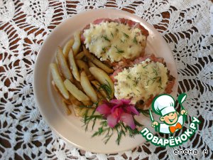 На гарнир подаeм жареный картофель и маринованные овощи.