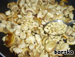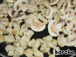 Куриную грудку нарезать мелкими кубиками, шампиньоны - пластинками. Обжарить слегка кусочки мяса, добавить шампиньоны.