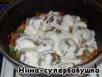 Довести до кипения, огонь уменьшить до минимума и тушить под крышкой в течение 10 минут.