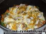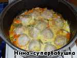 Переложить овощи в глубокий сотейник или жаровню, к овощам выложить тефтели.