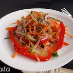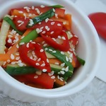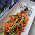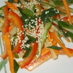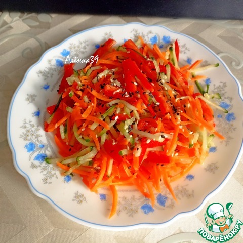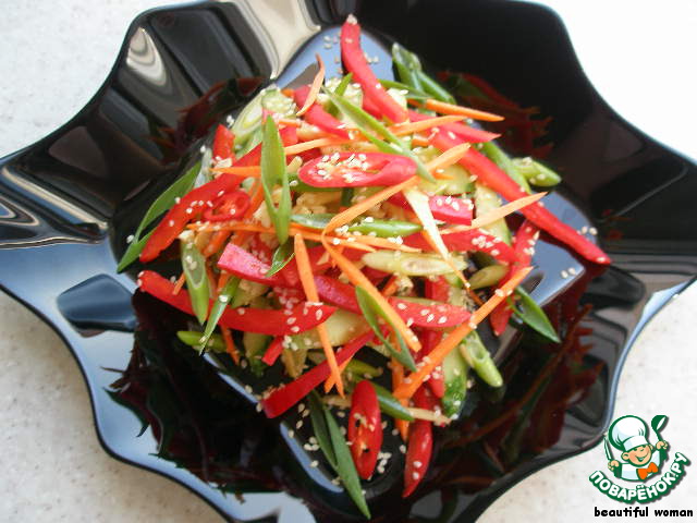 Смешиваем овощи с заправкой и выкладываем на тарелочку, посыпав кунжутными семечками.