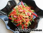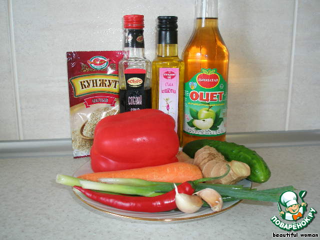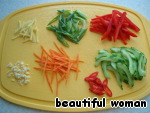 Нарезаем наши овощи соломкой, зеленый лук и перец чили нарежем вдоль наискосок, чеснок рубим ножом, корня имбиря возьмите кусочек 2 см величиной, больше нам не потребуется, дабы имбирь не заглушал вкус основных составляющих салата. Если жгуче-пряный имбирь Вам не по душе,вымочите его в воде 10 минут и, обсушив, добавьте в салат.