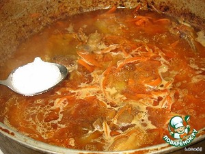 Залить кипятком, посолить и добавить молотую зиру, барбарис и замоченный с вечера нут (узбекский горох).