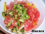 Теперь займемся грейпфрутом - очистим от пленок и нарежем кусочками. Мне попался слишком спелый, и он просто рассыпался на зернышки, но не страшно!