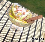Выкладываем наш салатик в креманки, посыпаем тертым белым шоколадом и украшаем палочками корицы. Я еще добавила немножко арахиса в кокосовом молоке.