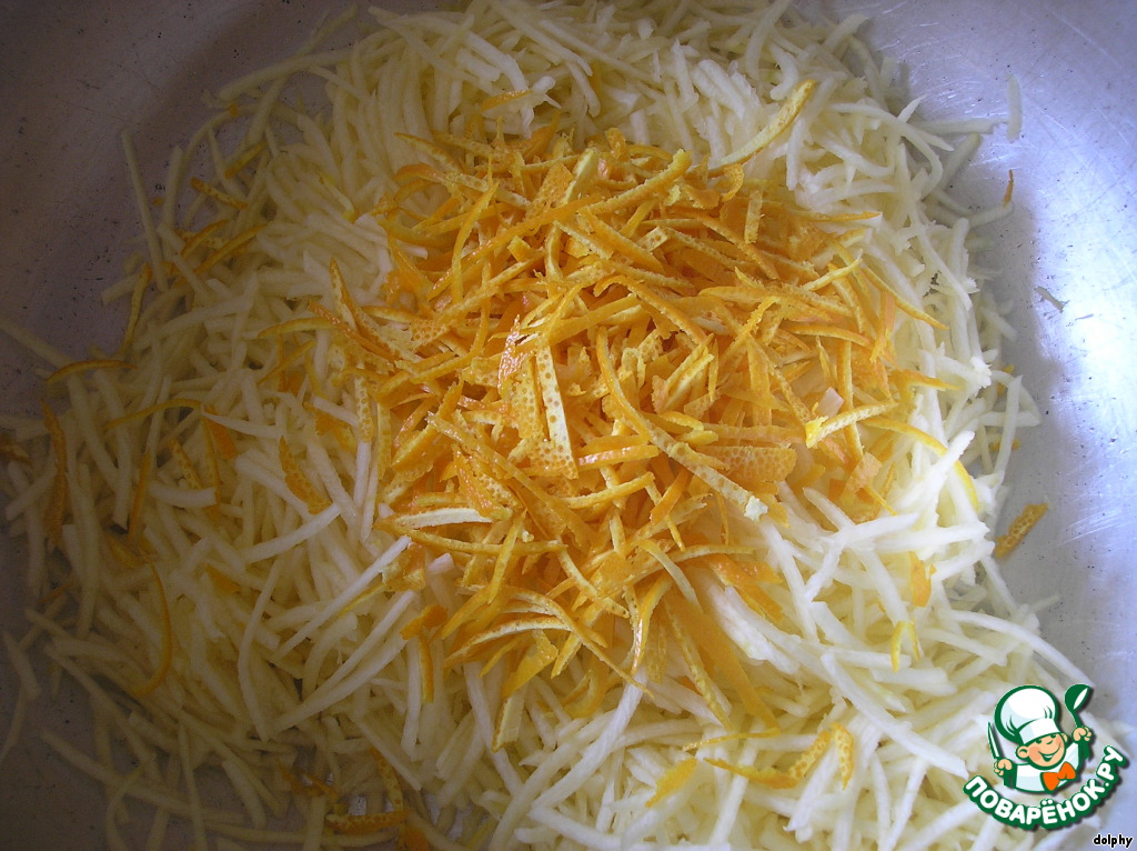 Мелко нарежьте ее и добавьте к цуккини. Можно просто потереть цедру на терке.