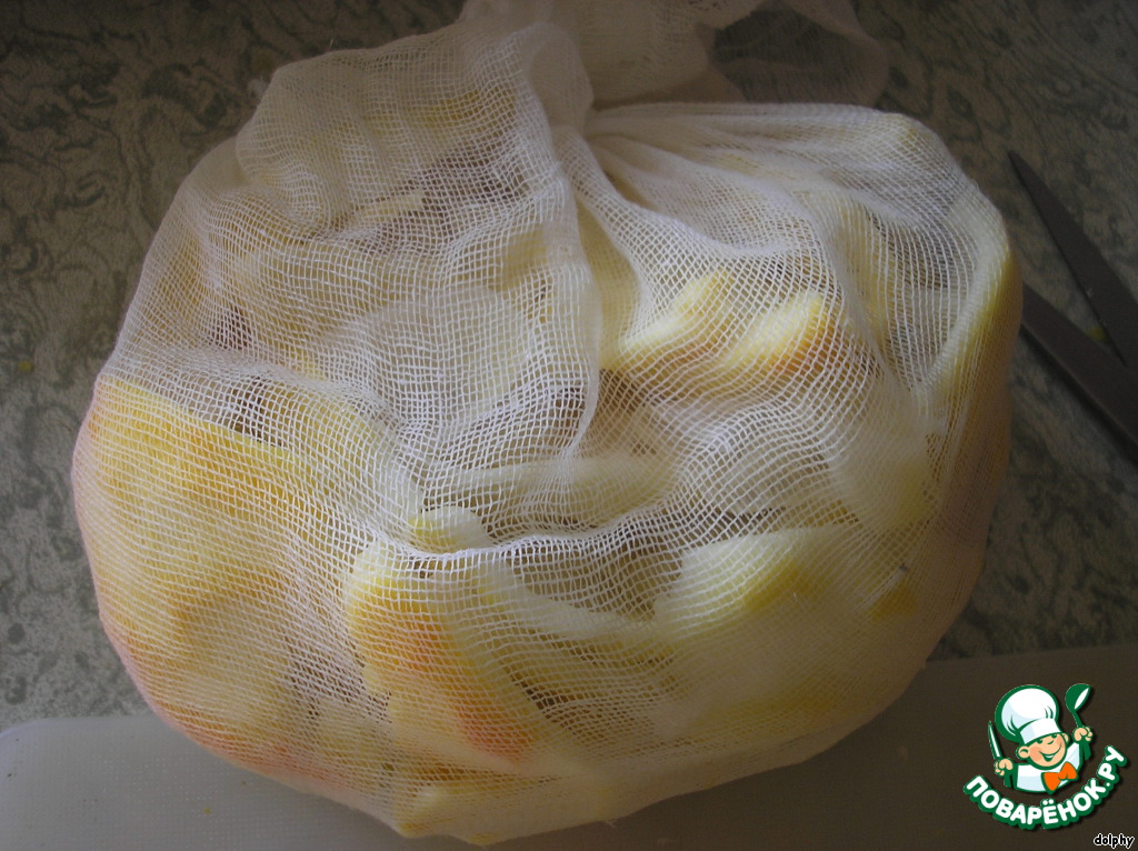 Очистите лимоны и апельсины от оставшейся кожуры и белой сердцевины, удалите косточки. Кожуру и сердцевину завяжите в большой марлевый мешочек.