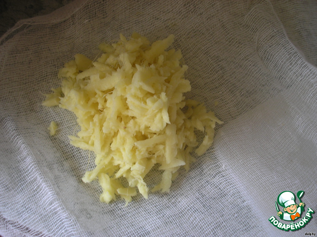 Натрите имбирь на терке и завяжите его в отдельный марлевый мешочек.