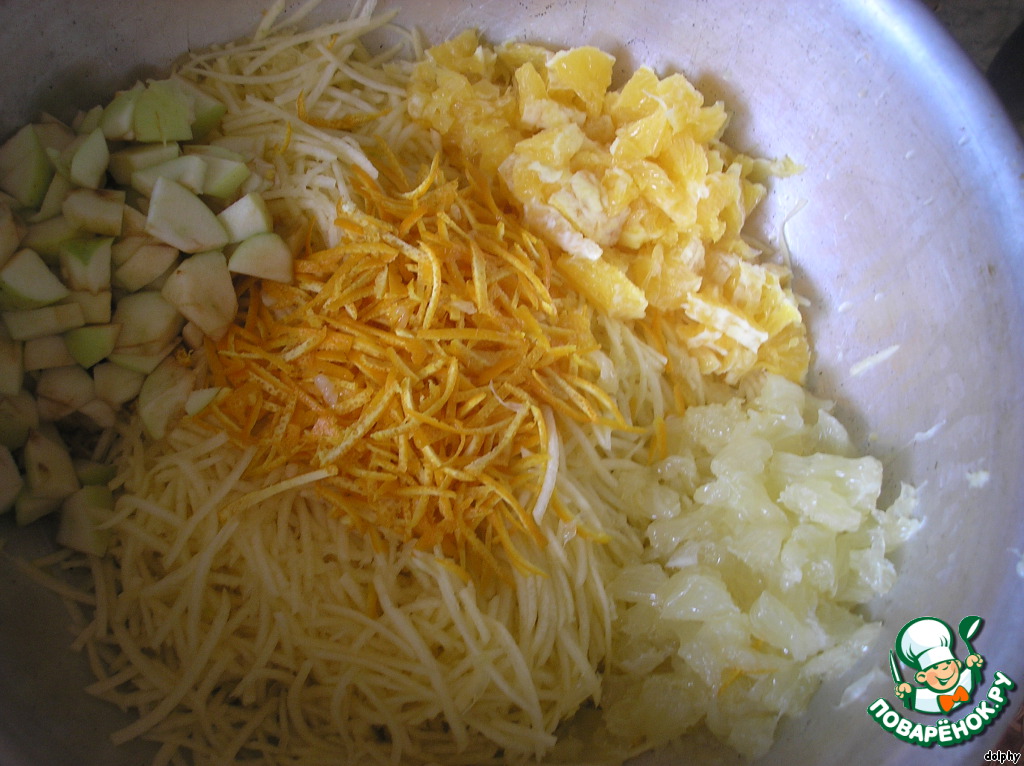 Мелко нарежьте апельсины, лимоны и яблоко, добавьте всё в кастрюлю к кабачкам.