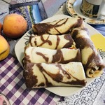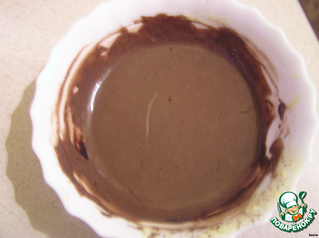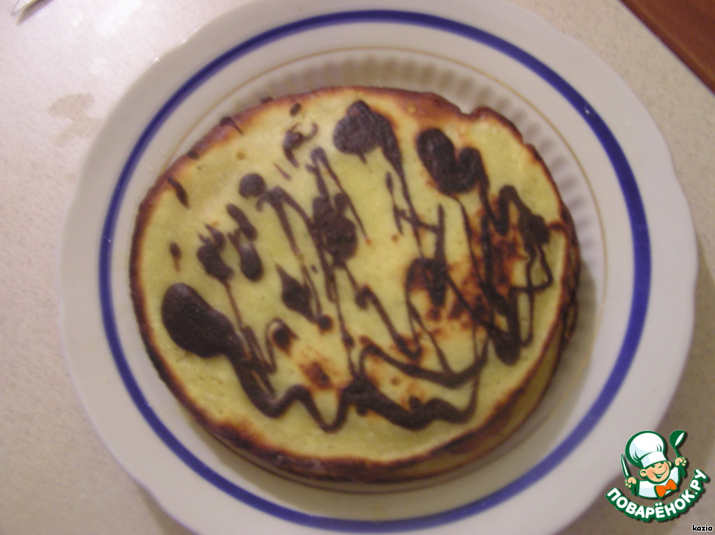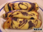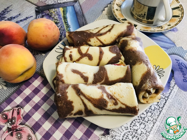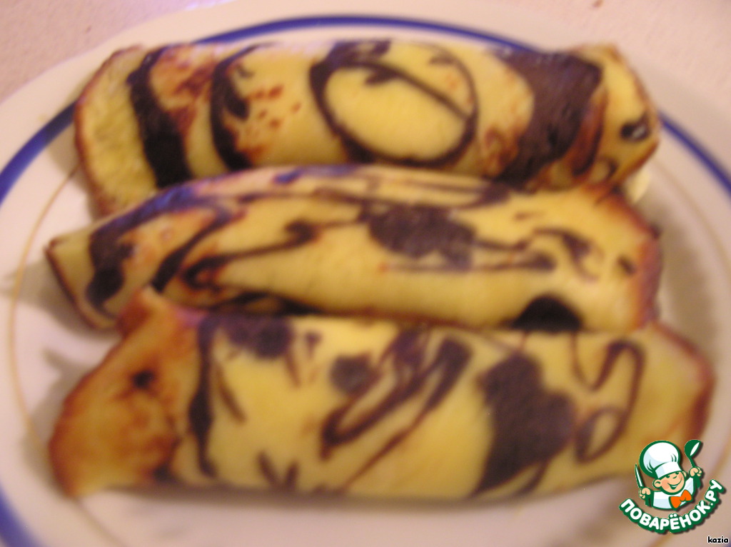 Жарить на горячей, смазанной подсолнечным маслом, сковородке: вылить порцию теста на сковородку, а сверху тонкой струйкой поставить кляксы тестом с какао. Повернуть на другую сторону на несколько секунд. -