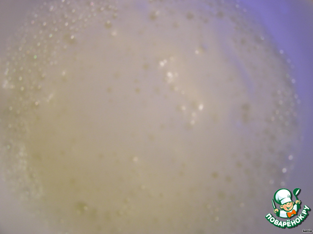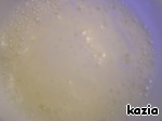 Перейти на низкую скорость, добавить крахмал, 1/2 муки, 1/2 сыворотки, остальную муку и сыворотку.