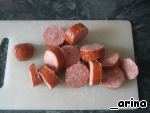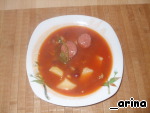 Теперь колбасу и картошку добавляем в кастрюлю, когда картошка сварится, солим, перчим и даем пару минут покипеть на медленном огне