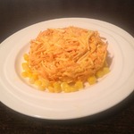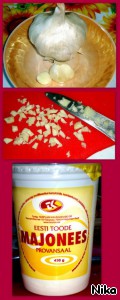 Твёрдый "Эстонский" сыр. Мелко нарезать (тёртый мне не очень нравится в этом салате). Немного посолить и смазать майонезом