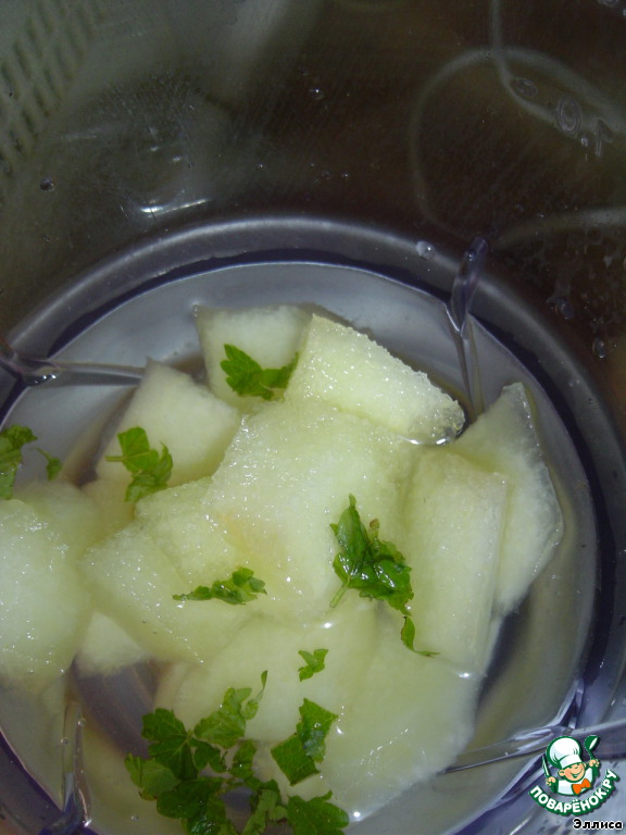 2. К дыне добавить сахар, 2 стакана воды, лимонный сок, мяту (по вкусу) и на высокой скорости взбить до однородной консистенции.