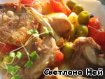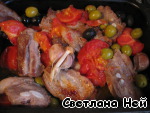 головку чеснока делим пополам. Вместе с помидорами и оливками кладем в жаропрочную форму. Сбрызгиваем маслом, солим, перчим и отправляем в духовку, разогретую до 200 град., на 30 мин.