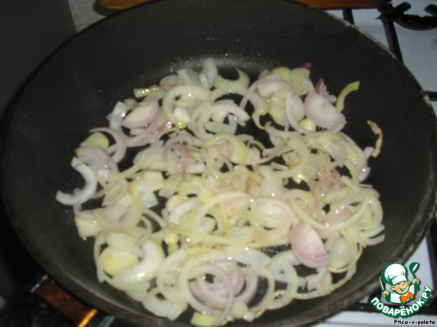 Для начинки лук нарезаем полукольцами и обжариваем до золотистого цвета. -