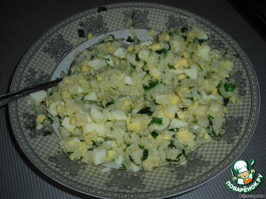 Рис отвариваем, добавляем сливочное масло, смешиваем с порубленными яйцами и зеленью.