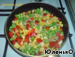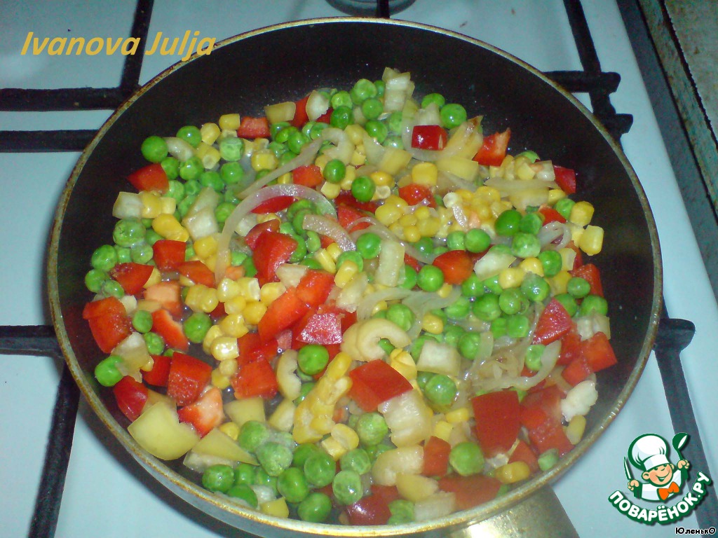 Нарезанный кубиками перец и остальные овощи добавляем на сковородку, перемешиваем и оставляем немного протушиться.