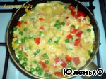 • Выливаем яйца на сковородку с овощами, всё равномерно распределяем.
